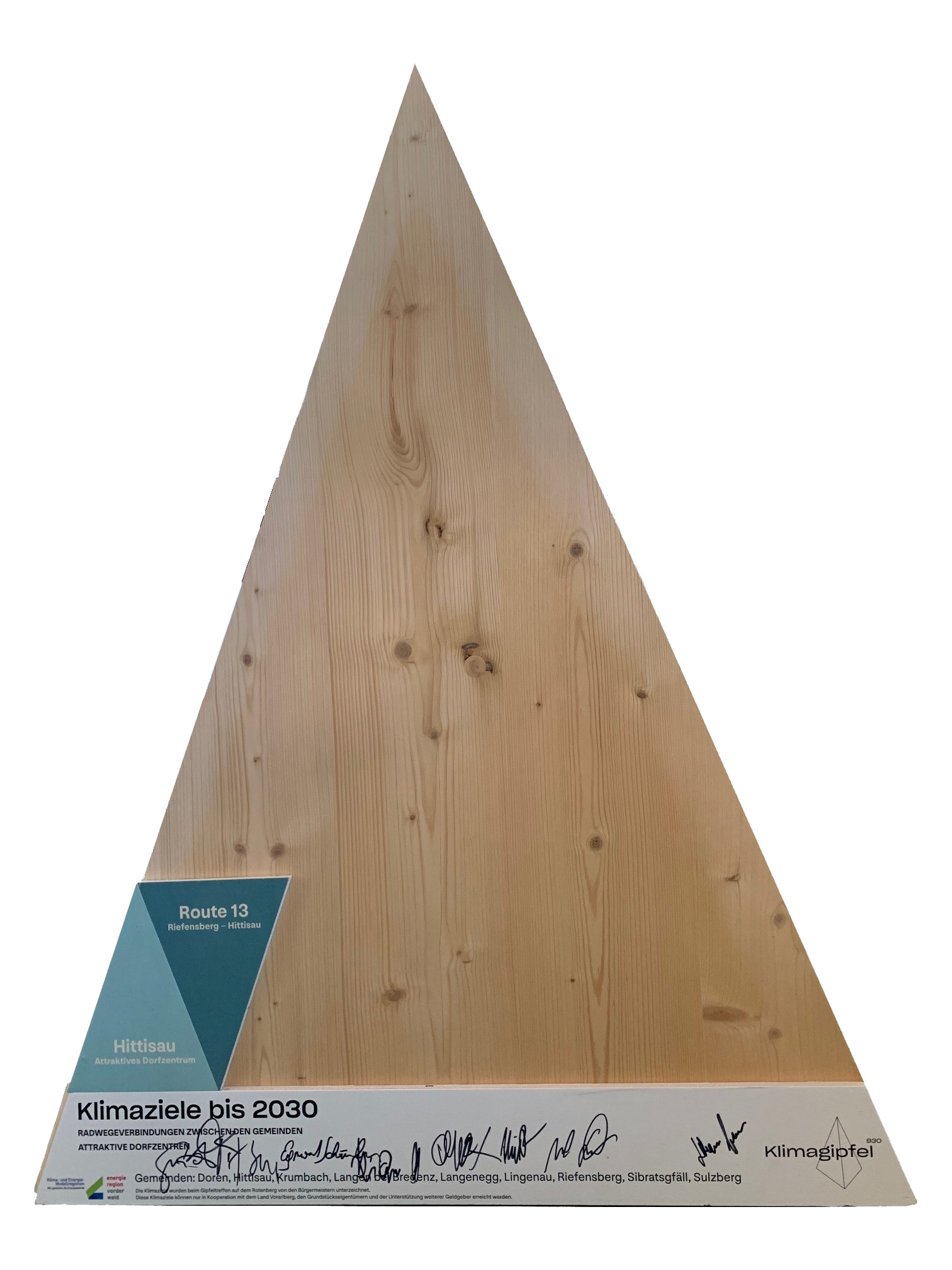 Seit 2022 findet jährlich der Vorderwälder Klimagipfel jeweils im September statt. Die Unterzeichnung regional beschlossener Klimaziele sowie das Monitoring der Zielerreichung wird auf einem echten Gipfel zusammen mit Klimaverantwortlichen und Interessierten der Region zelebriert. Gemeinsam wird ein Gipfel des Vorderwaldes erwandert.  Oben erwartet die Wandernden ein Klimagipfel aus Holz: er zeigt anschaulich, wie weit die Gemeinden bei der Erreichung ihrer selbst definierten Ziele bereits gekommen sind. Bis 2030 haben sich die Gemeinden folgende Ziele gesetzt:
